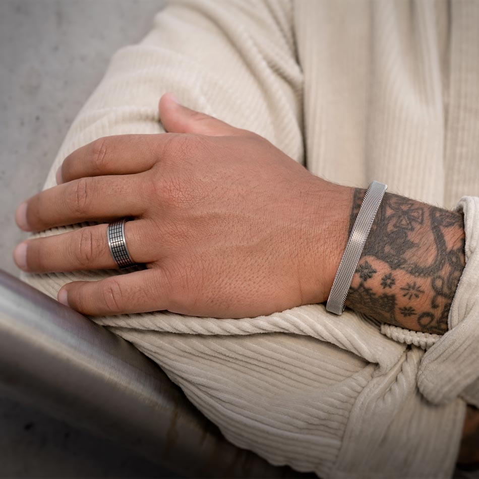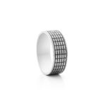 Este anel para homem apresenta um padrão geométrico inspirado em linhas retas e quadriculadas, criando um visual único e impactante. Permite a opção de gravação personalizada no interior, permitindo que você adicione nomes, datas ou mensagens especiais, tornando-o uma peça significativa e exclusiva. Ideal para homens que buscam um acessório com personalidade e estilo distinto.