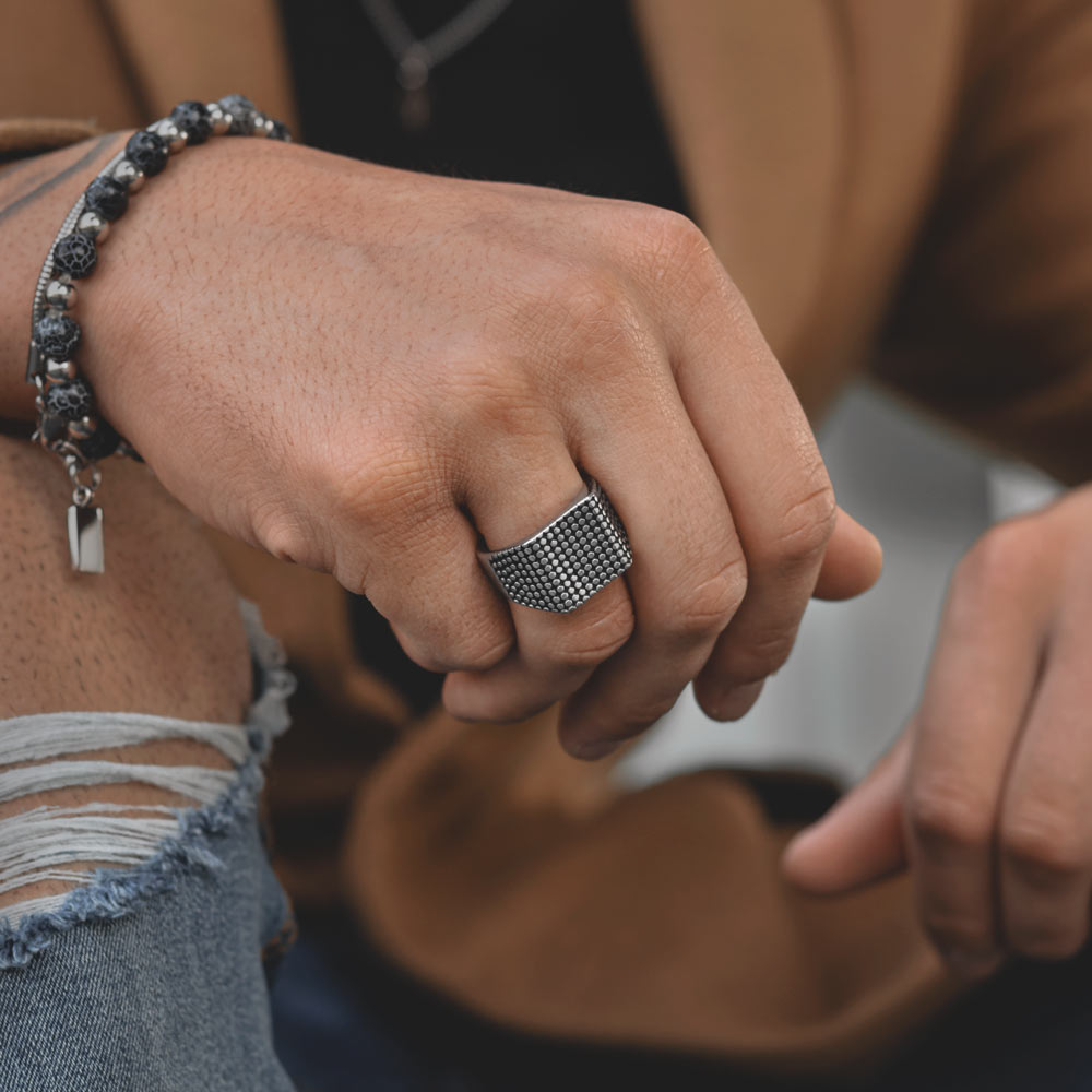 Este anel para homem destaca-se pelo seu design imponente e texturizado, com uma face retangular revestida por um padrão em relevo de pontos contrastantes. O acabamento detalhado oferece um toque moderno e inovador. Combinando estilo e personalidade, este anel é a escolha perfeita para quem valoriza acessórios arrojados e autênticos.