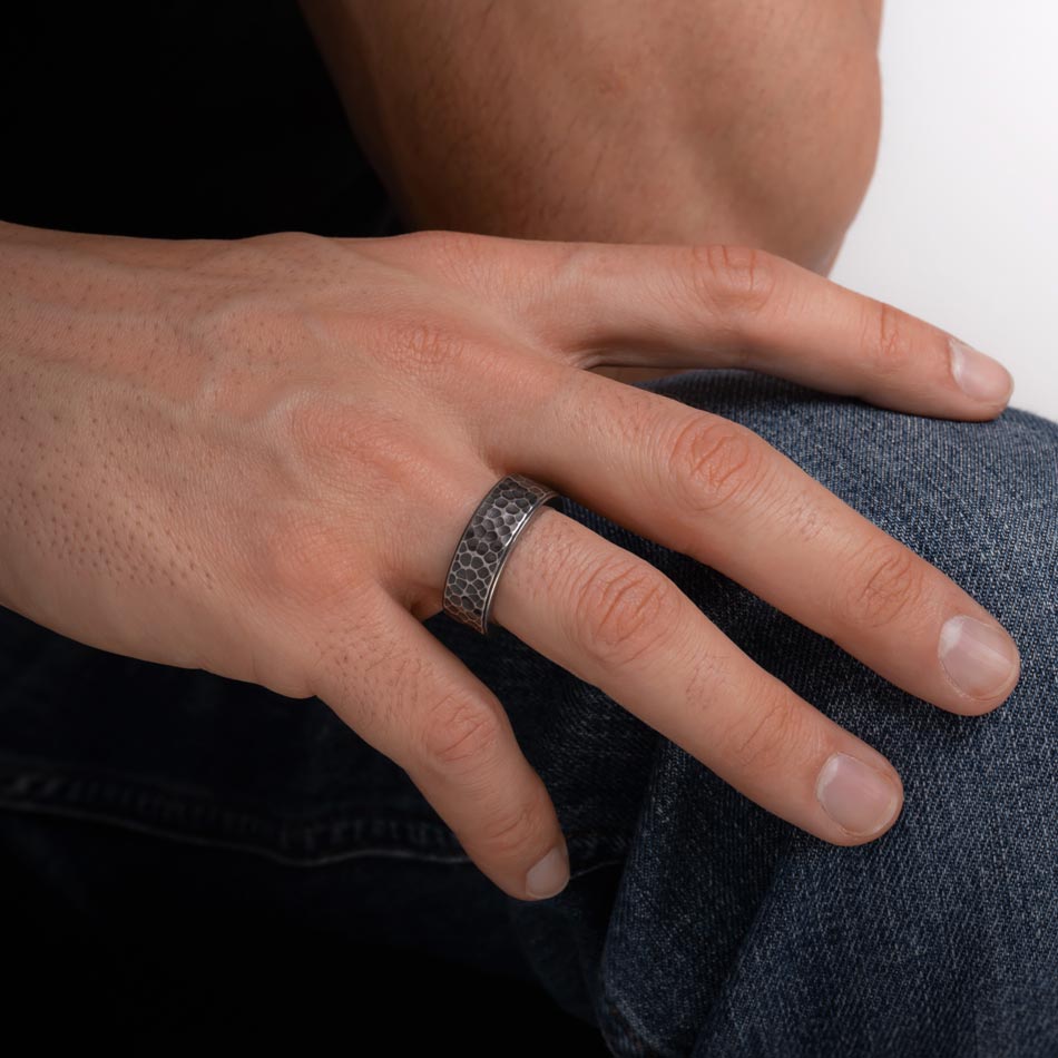 Este anel masculino apresenta um design robusto com um exclusivo padrão texturizado em relevo, inspirado em formas geométricas naturais. Com um acabamento rústico e fosco, a peça oferece um visual autêntico e marcante.