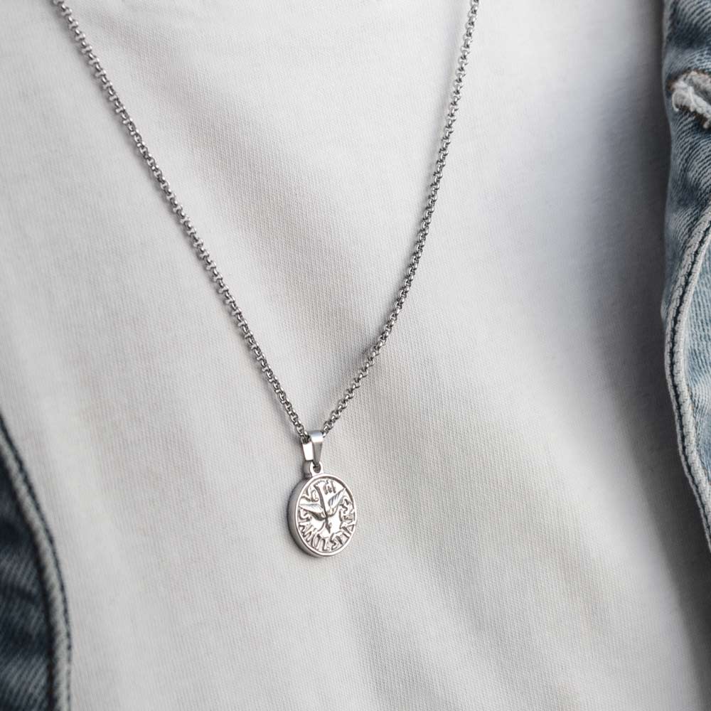 Colar masculino em aço inoxidável com medalha do Espírito Santo, representada por uma delicada pomba em alto-relevo, símbolo de paz e espiritualidade. Fabricado em aço inoxidável, este colar garante durabilidade e resistência ao desgaste, mantendo seu brilho ao longo do tempo. Ideal para uso diário ou ocasiões especiais, é um presente significativo e sofisticado.