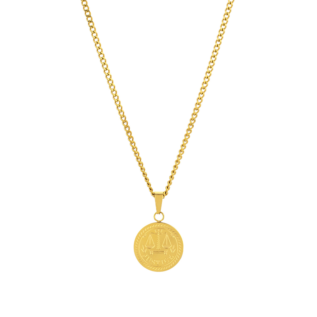 Colar masculino em aço inoxidável com um pendente em formato de medalha, gravado com a icônica balança da justiça. Esta peça simboliza equilíbrio, equidade e determinação, sendo perfeita para homens que valorizam esses princípios. O design refinado e resistente oferece sofisticação e estilo, ideal para complementar qualquer visual.