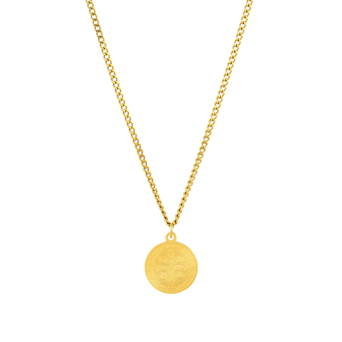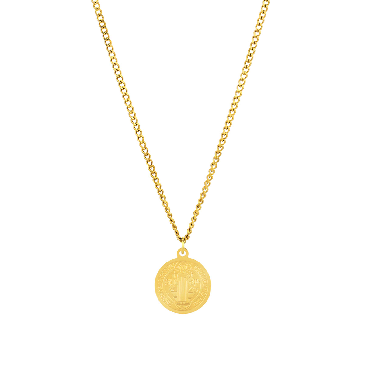 Colar masculino em aço inoxidável Dourado com um pendente em formato de medalha detalhadamente trabalhado. A medalha exibe um design clássico e atemporal, ideal para homens que apreciam acessórios com significado e elegância. Este colar combina versatilidade com um toque de sofisticação, perfeito para compor looks casuais ou formais, trazendo personalidade e estilo ao visual.