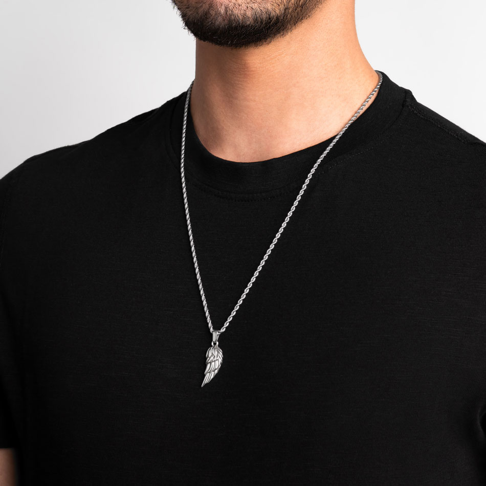 Colar masculino em aço inoxidável com pendente em formato de asa, simbolizando liberdade, proteção e espiritualidade. Fabricado em aço inoxidável, este colar garante durabilidade e resistência ao desgaste, mantendo seu brilho ao longo do tempo. Ideal para uso diário ou ocasiões especiais, é um presente significativo e sofisticado.