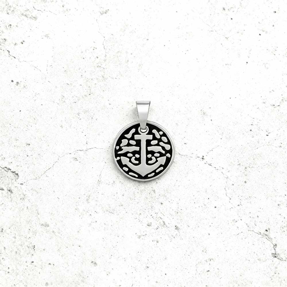 O pendente Medalha âncora Watsonville, com uma âncora que contrasta com o acabamento escurecido na medalha, é produzido em aço inoxidável antialérgico, ideal para adicionar a um colar da Twobrothers com uma largura máxima de 0,35 cm.
