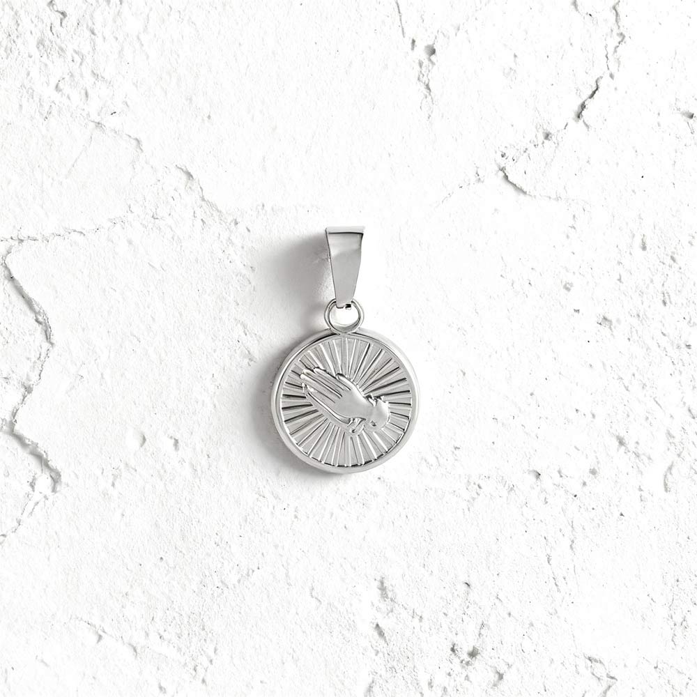 O pendente Medalha Auburn, com duas mãos de oração, é produzido em aço inoxidável antialérgico, ideal para adicionar a um colar da Twobrothers com uma largura máxima de 0,35 cm.