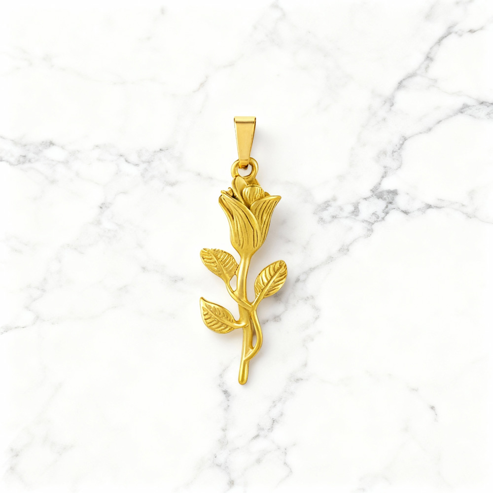 O pendente Portland Rose Gold, em forma de rosa, é produzido em aço inoxidável antialérgico dourado, ideal para adicionar a um colar da Twobrothers com uma largura máxima de 0,35 cm.