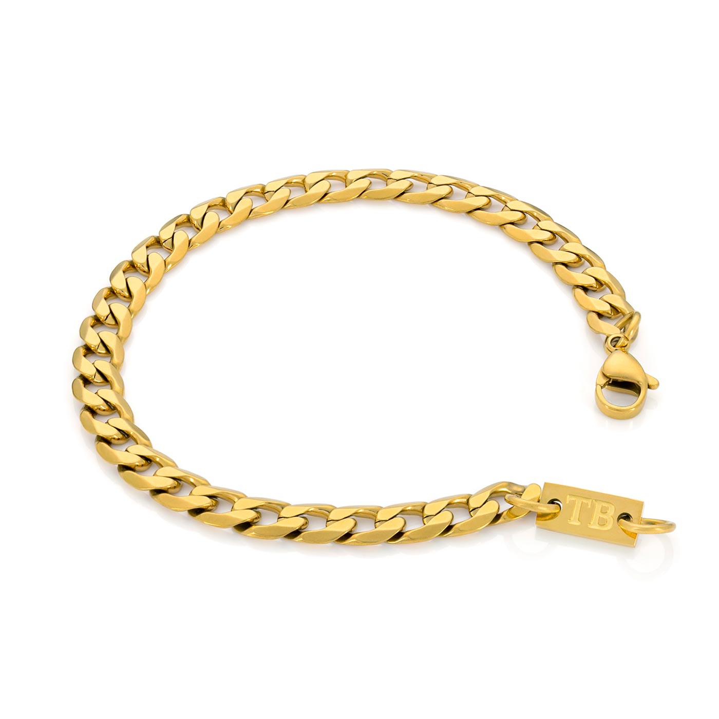 Pulseira masculina dourada com um design moderno de elos robustos, esta peça apresenta um acabamento polido que realça o seu brilho intenso, proporcionando um visual impecável e refinado.