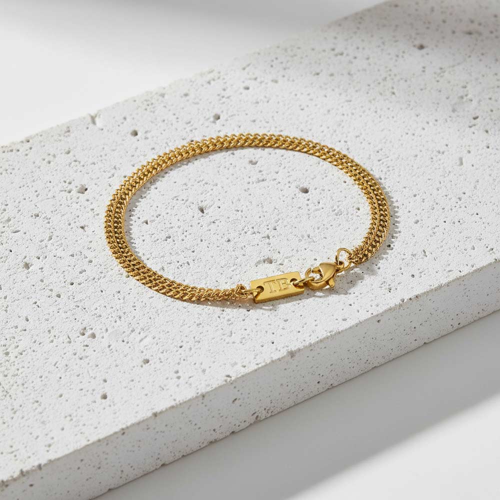 Com um design minimalista de malha dupla dourada confere um look simples e luxuoso. Perfeita para complementar looks casuais ou formais, esta pulseira masculina dourada é a escolha ideal para homens que valorizam acessórios simples e elegantes.