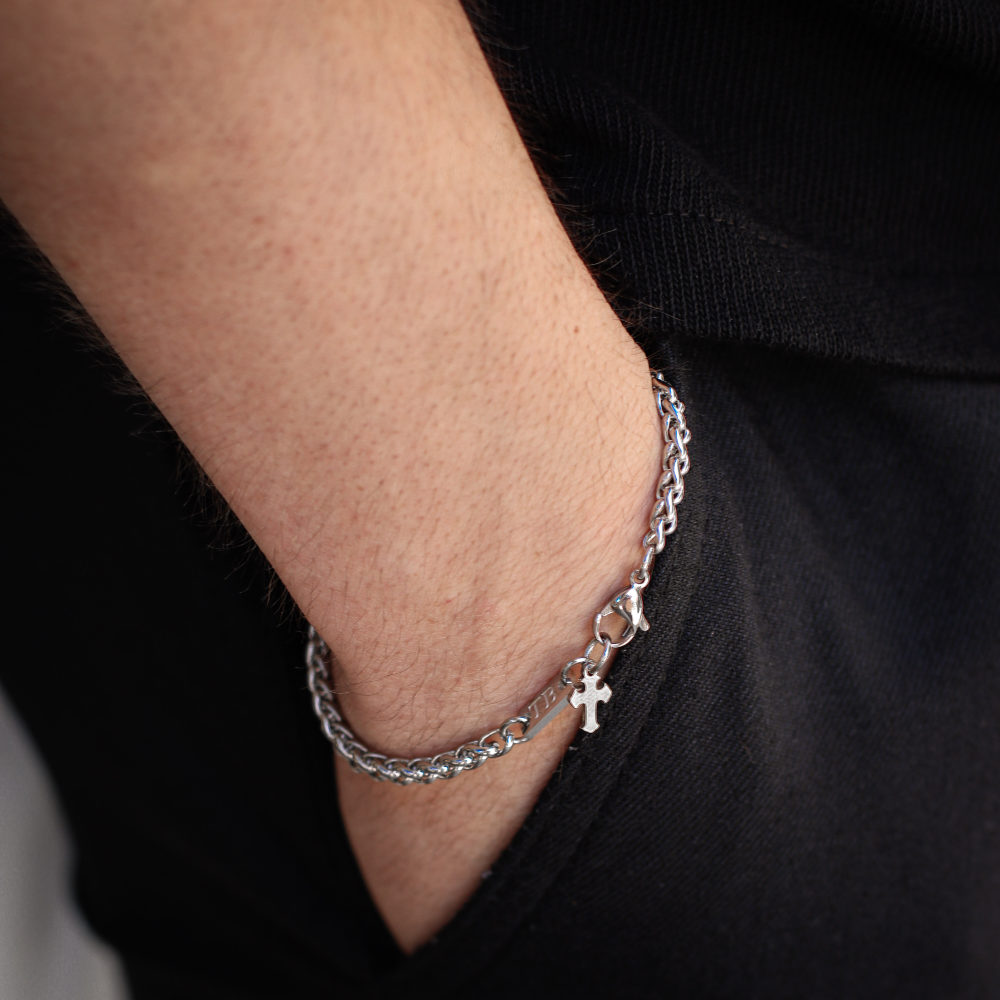 O motivo pelo qual a Pulseira Collin Cruz é a escolha certa? Esta pulseira para homem, fina, prateada e com um pendente em forma de cruz, representa fé, força e equilíbrio. É o acessório ideal para quem valoriza estilo, qualidade e um detalhe simbólico carregado de significado espiritual e pessoal.
