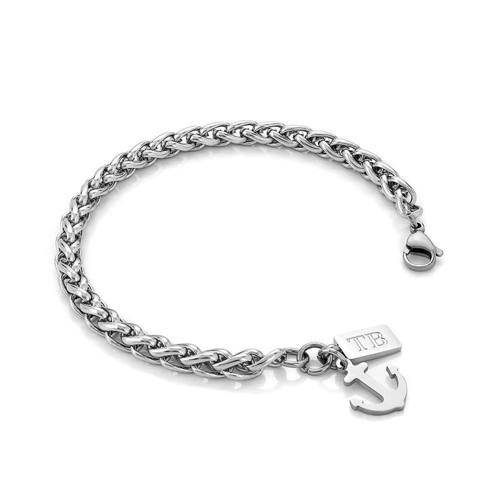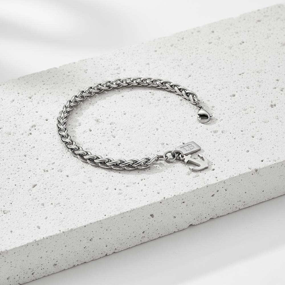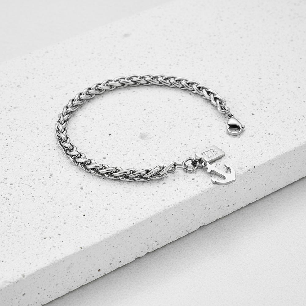 Esta pulseira para homem prateada e com um pendente em forma de âncora, representando força e estabilidade, é o acessório ideal para quem procura um toque de estilo náutico e moderno.