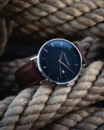 Elegância e resistência estão presentes neste relógio masculino em aço inoxidável. O seu design robusto e sofisticado é complementado pelo mostrador preto de alto contraste, protegido por um vidro de safira, extremamente resistente a riscos. A bracelete em pele castanha proporciona um ajuste confortável e um visual clássico.